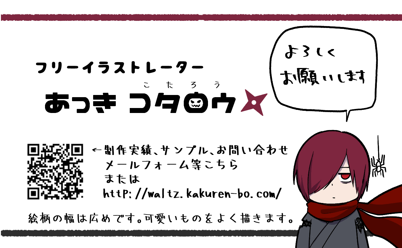 ■主な実績AKB48Team8 坂口渚沙様 卒業公演 入場特典公式配布うちわイラスト・デザイン読売新聞 伊賀版/オンライン版連載「三重大発!忍び学でござる」図説北九州市紫川10橋リボーン計画「風の橋」活用イメージイラストふるさと納税返礼品(茨城県大洗町)2022年12月~1月期間限定配布イラスト2021年東京都性感染症ナビ公開・配布リーフレット デザイン/イラスト